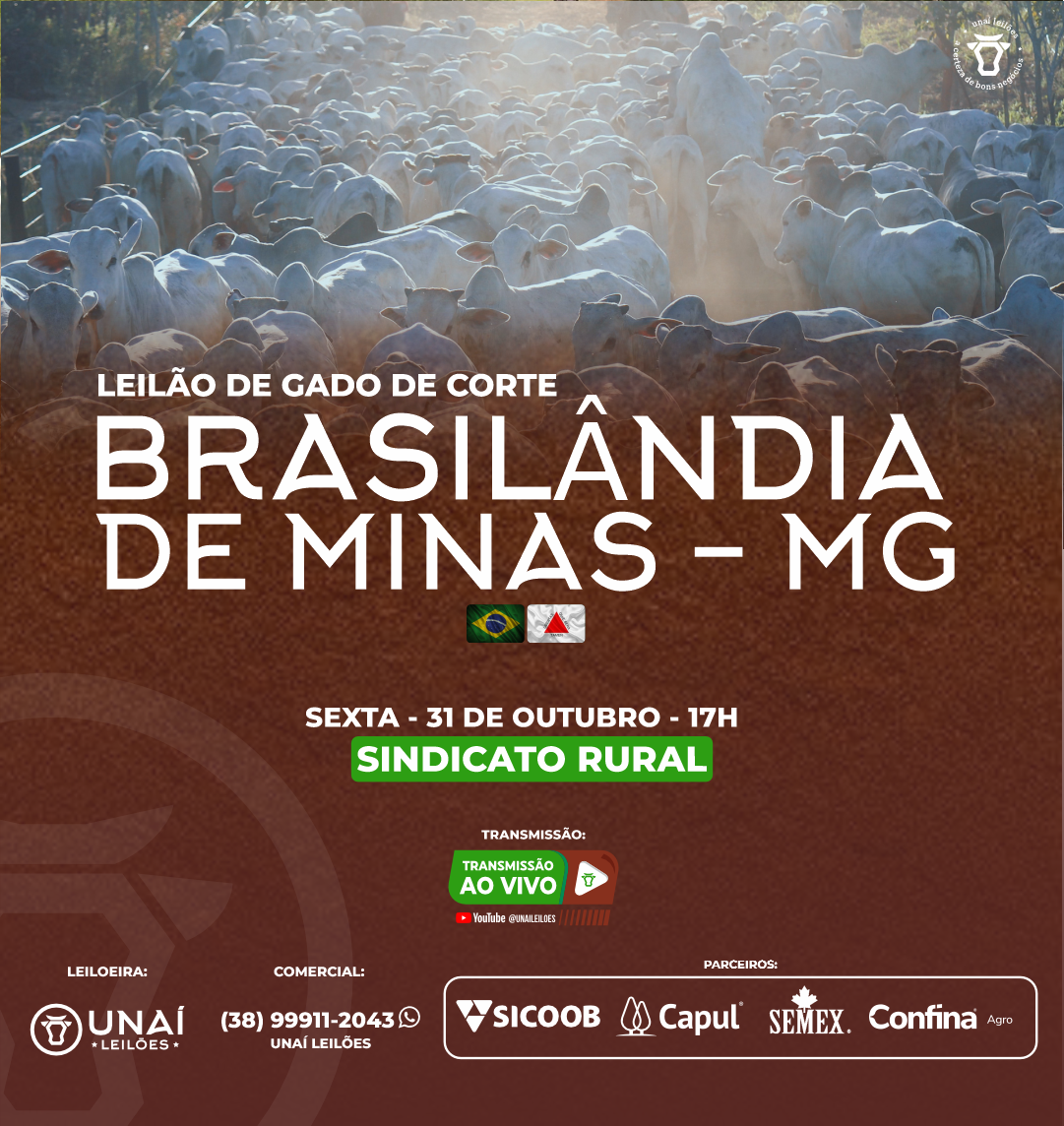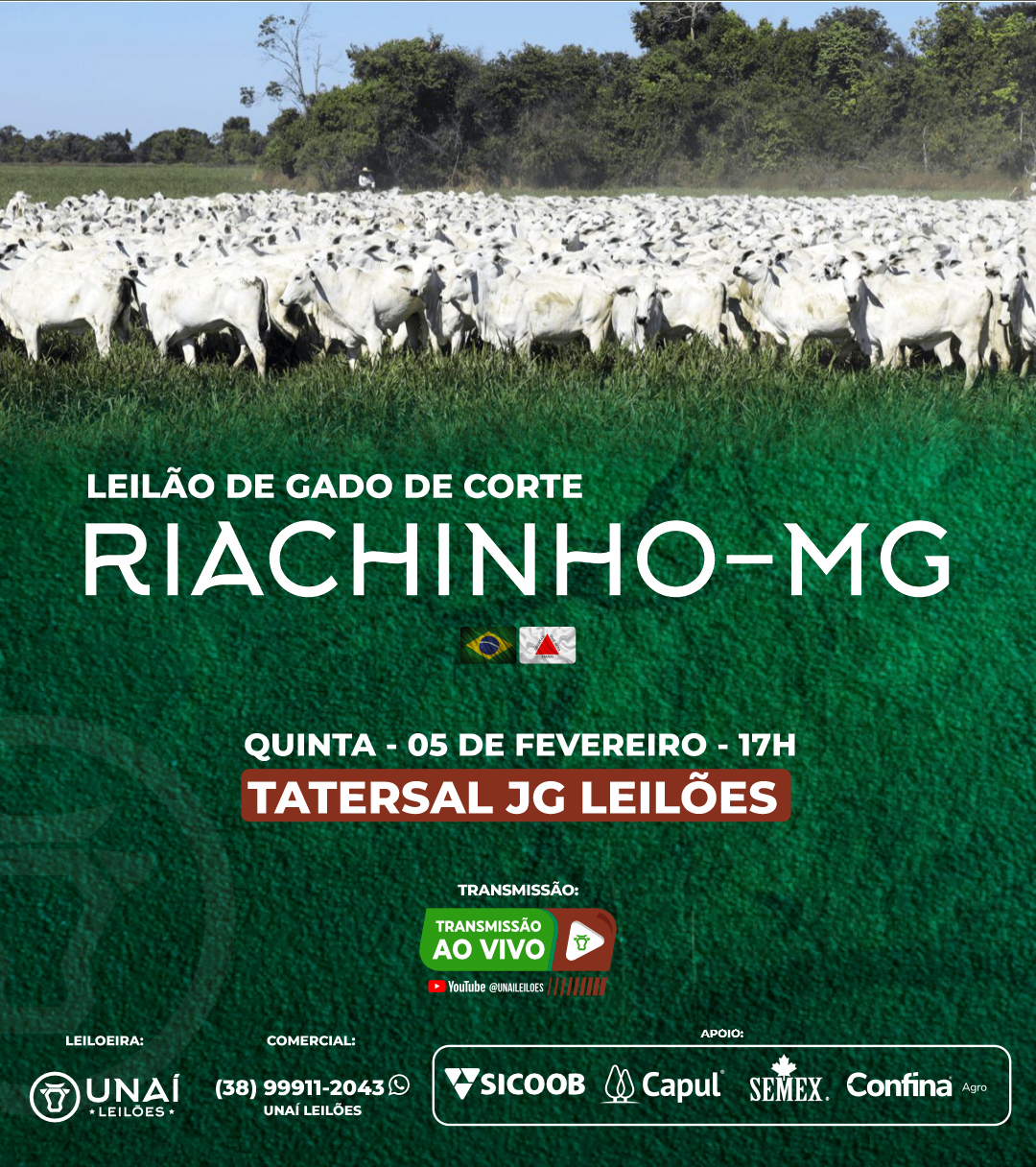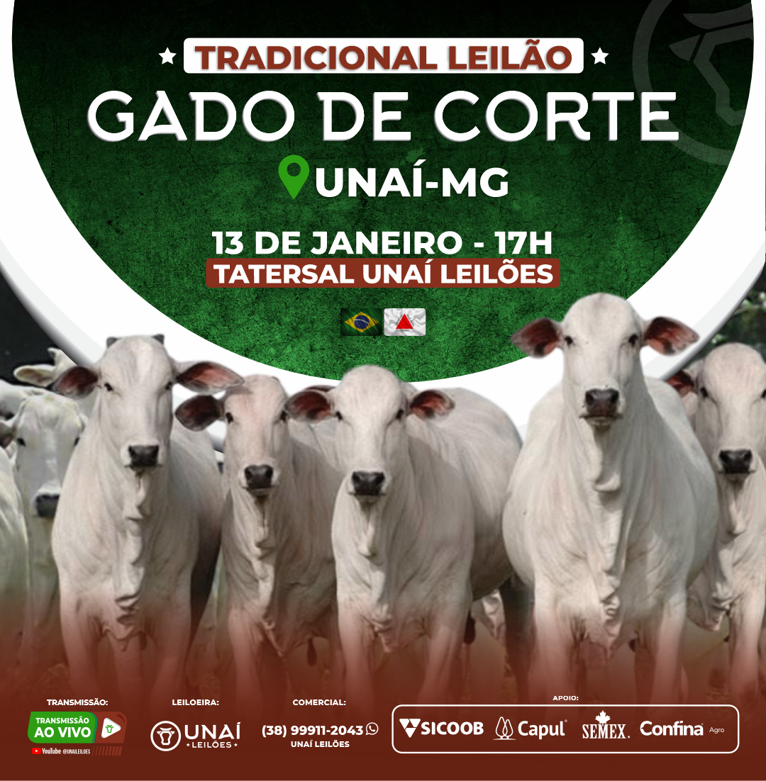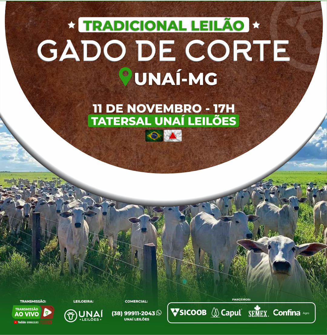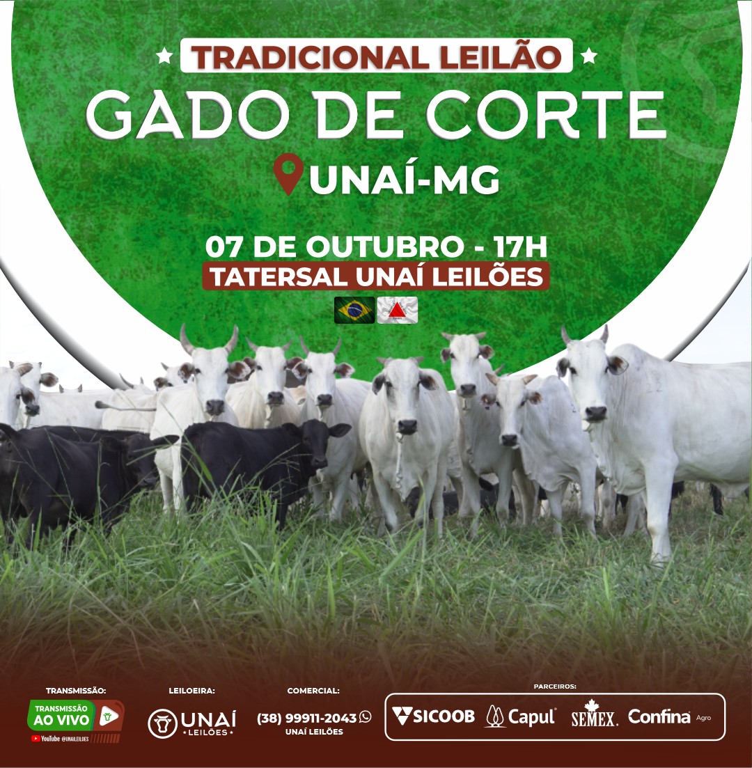Início: 03/03/2026 às 17:00:00 Fim: 03/03/2026 às 23:00:00 LEILÃO DE GADO DE CORTE DE UNAÍ-MG Ver Lotes