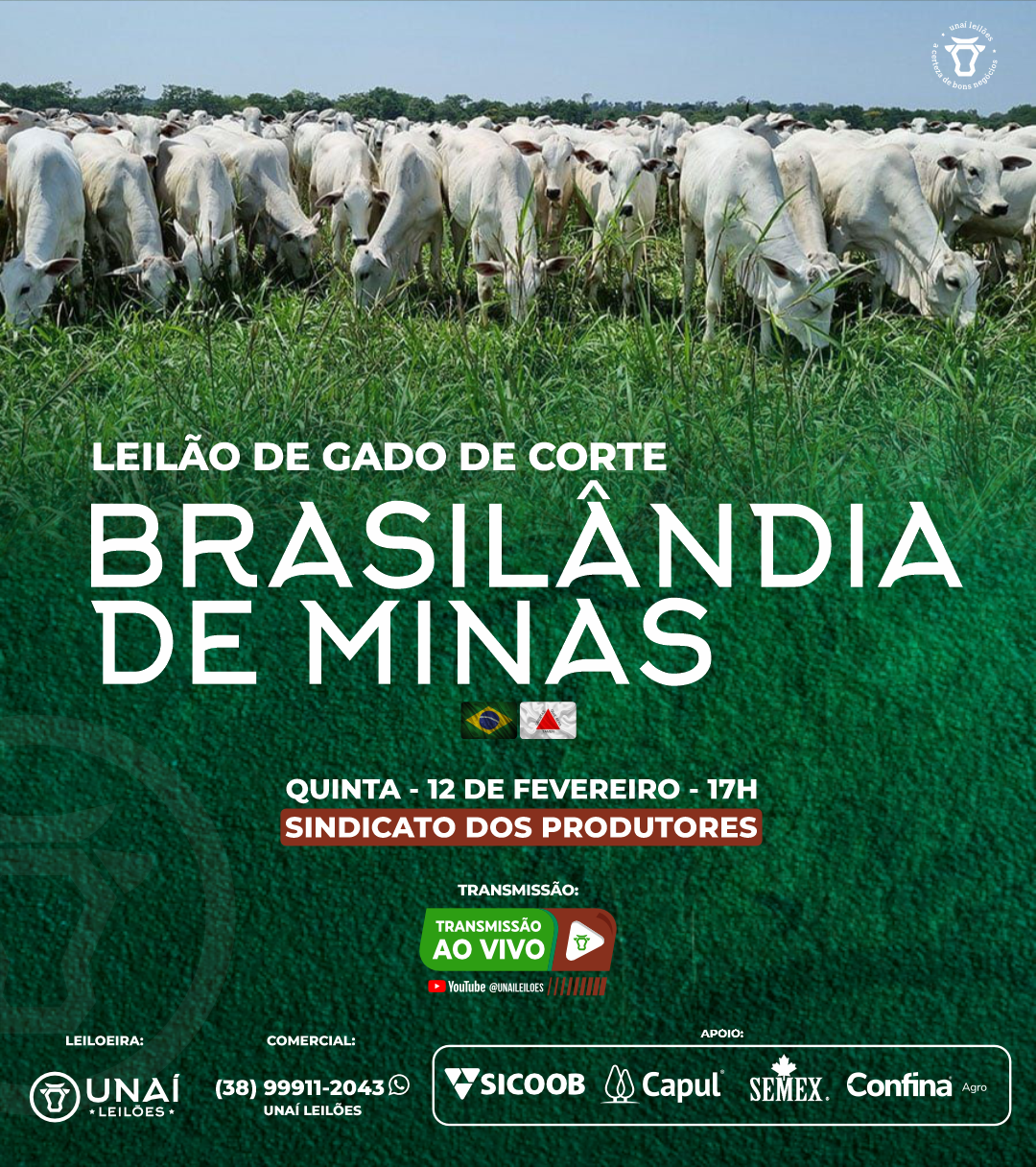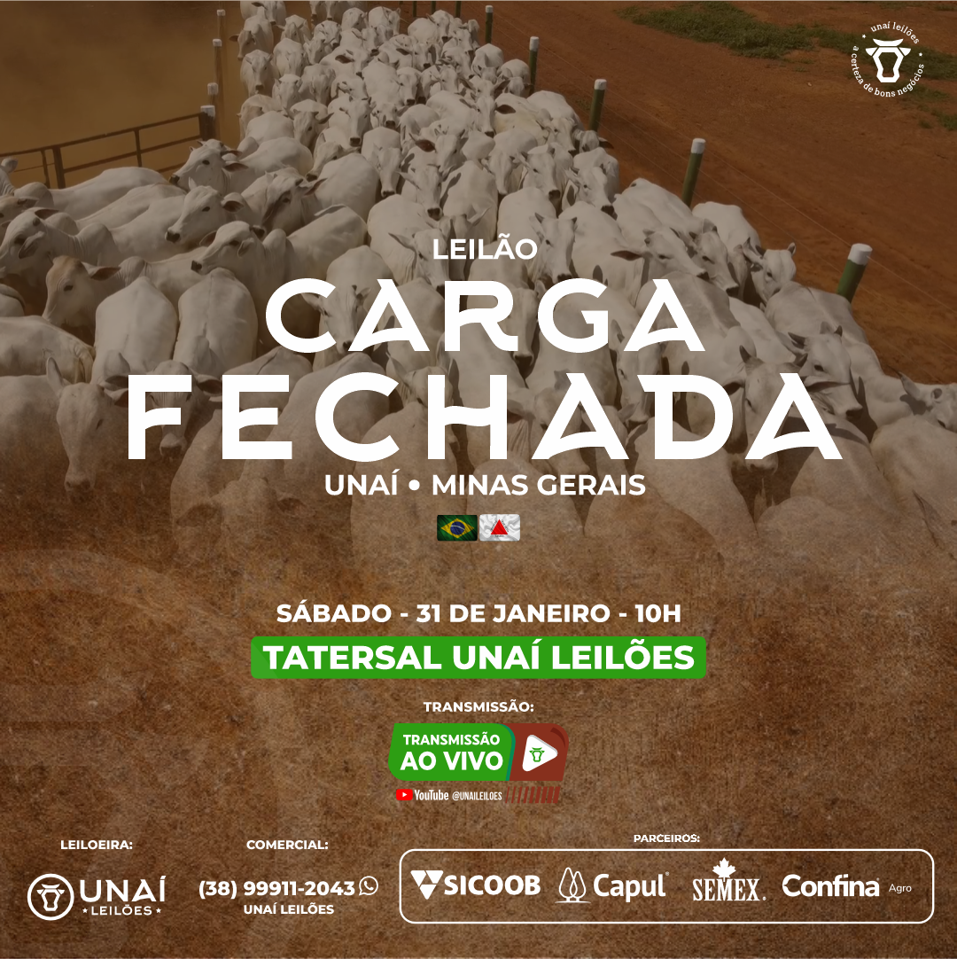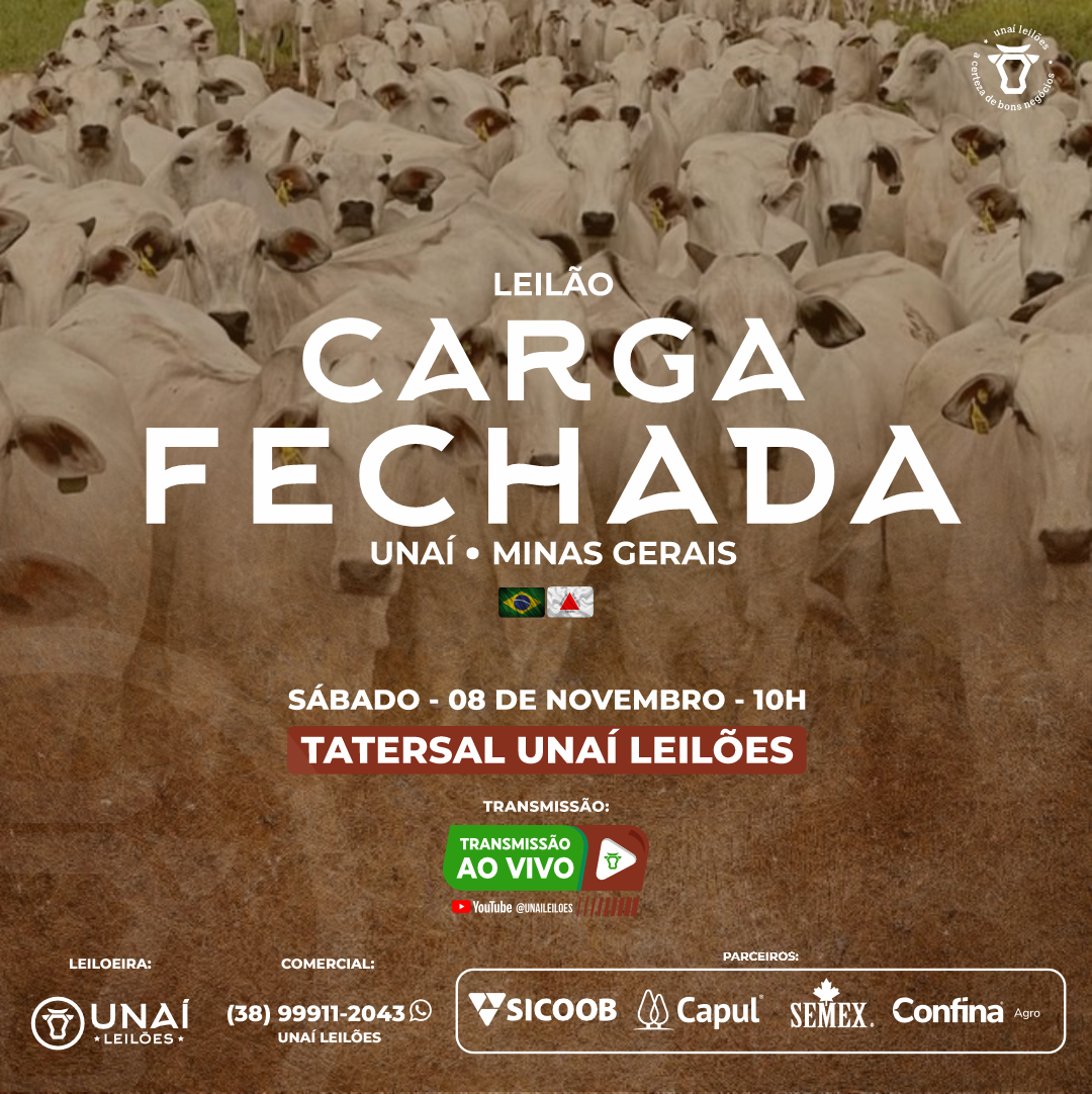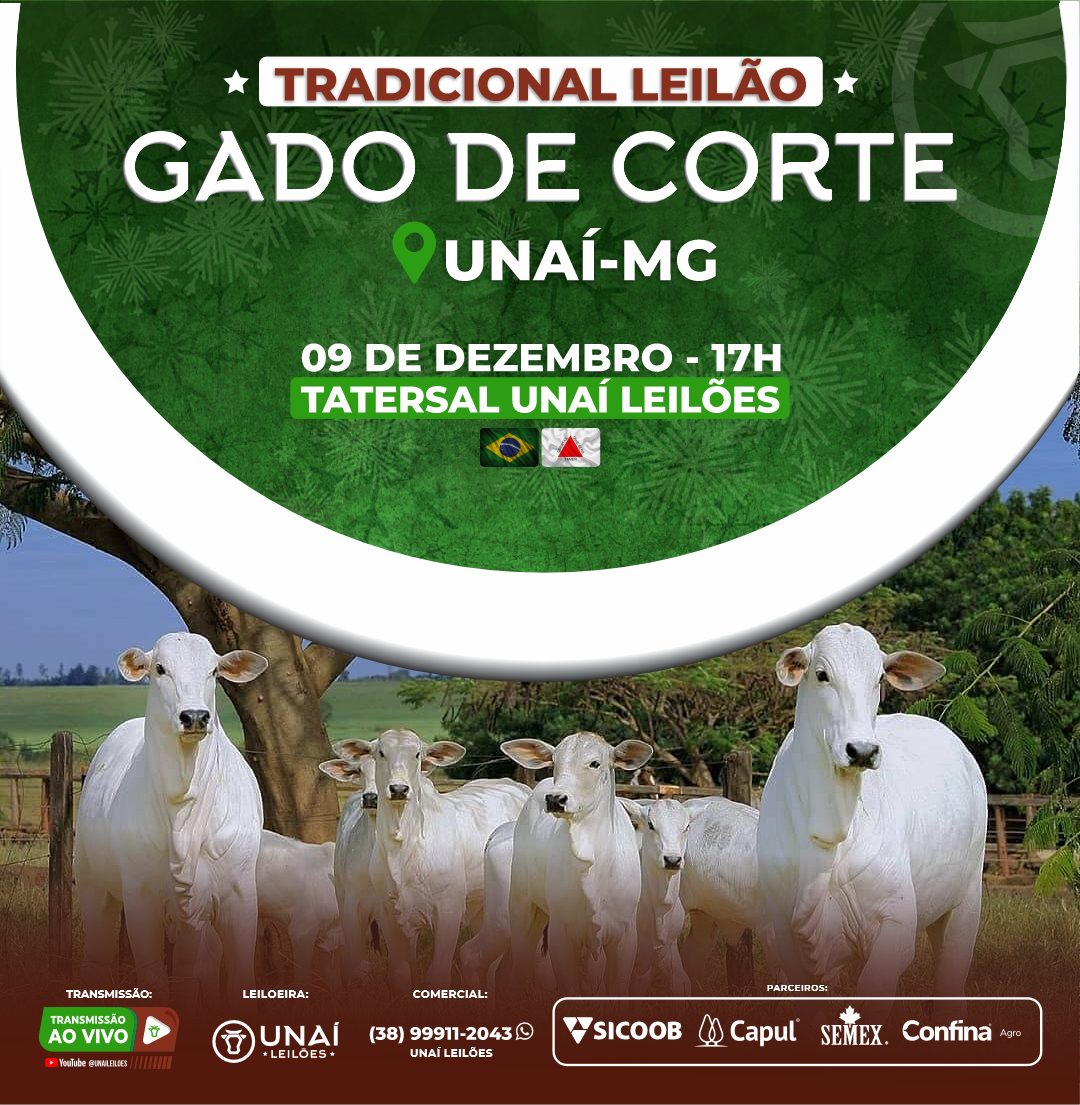 Início: 03/03/2026 às 17:00:00 Fim: 03/03/2026 às 23:00:00 LEILÃO DE GADO DE CORTE DE UNAÍ-MG Ver Lotes