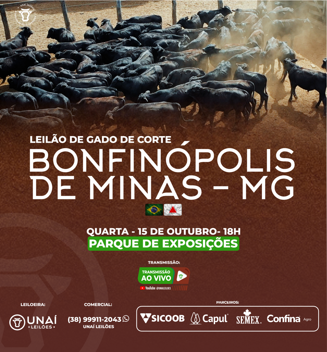 Início: 19/03/2026 às 17:00:00 Fim: 19/03/2026 às 23:00:00 LEILÃO DE GADO DE CORTE DE BONFINÓPOLIS DE MINAS-MG Ver Lotes