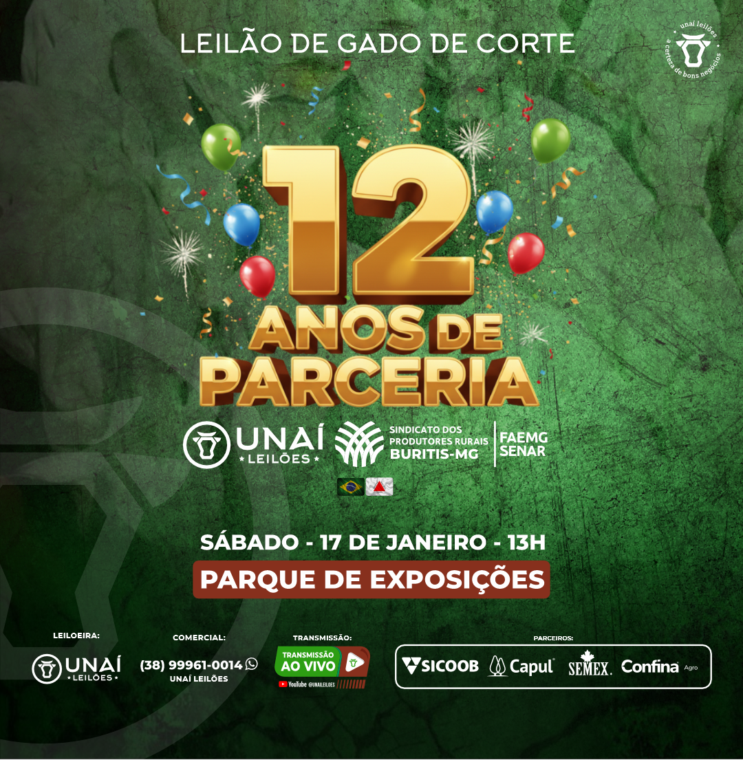 Início: 12/03/2026 às 17:00:00 Fim: 12/03/2026 às 23:00:00 LEILÃO DE GADO DE CORTE DE BURITIS-MG Ver Lotes