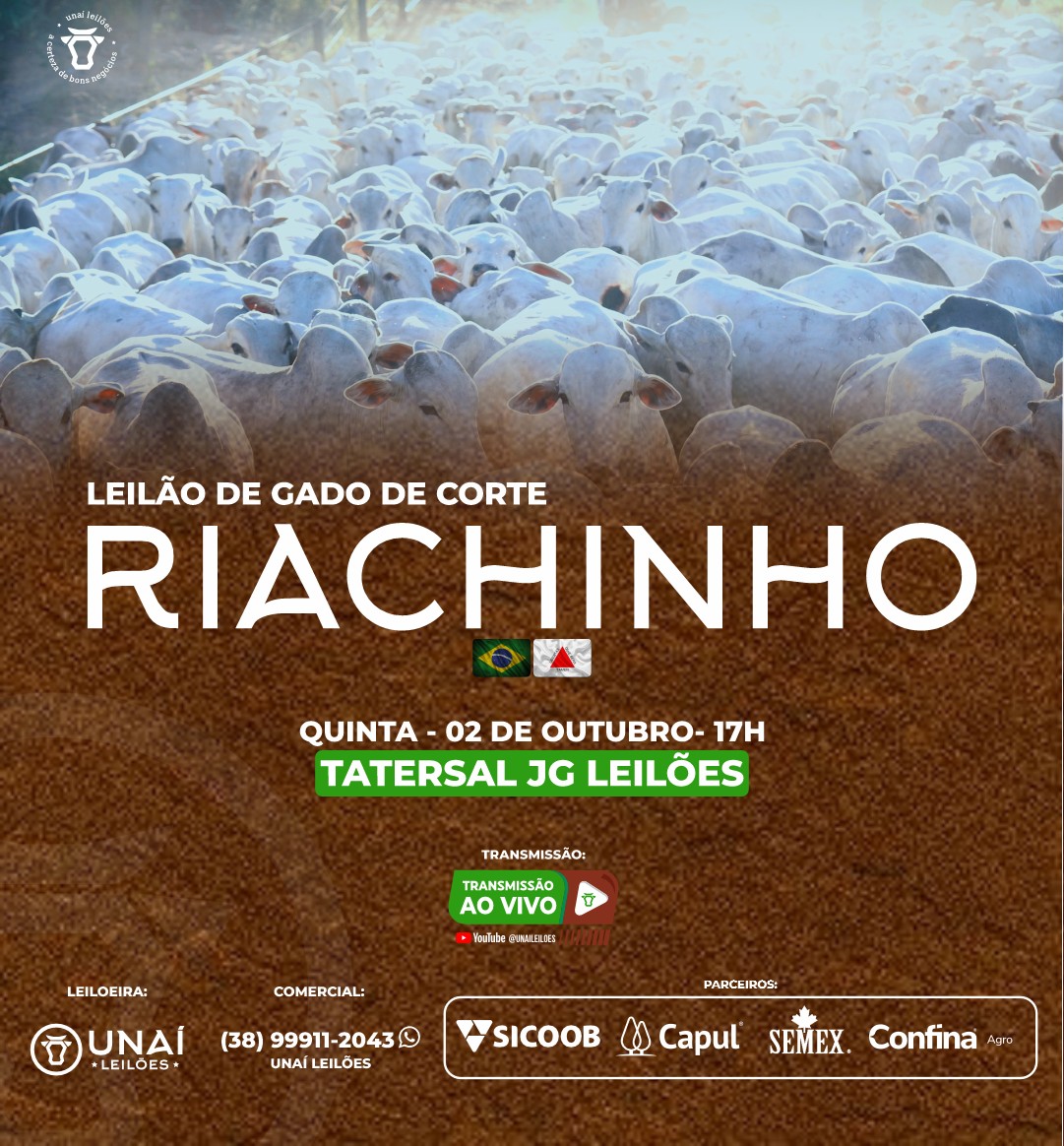 Início: 13/03/2026 às 17:00:00 Fim: 13/03/2026 às 23:00:00 LEILÃO DE GADO DE CORTE DE RIACHINHO-MG Ver Lotes