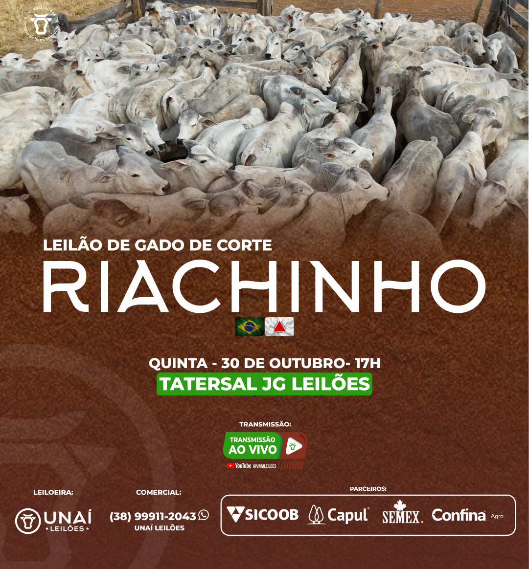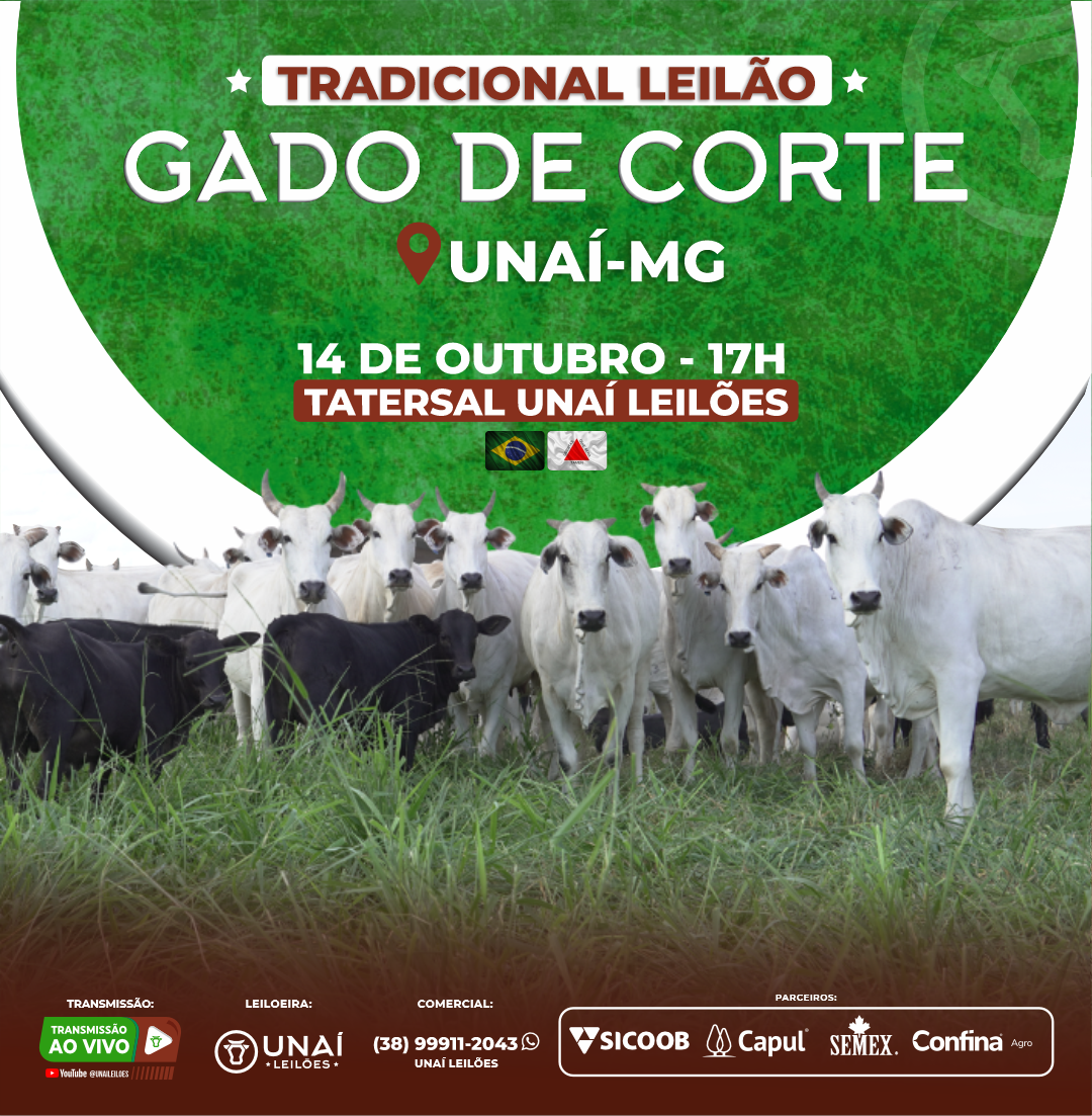 Início: 10/03/2026 às 17:00:00 Fim: 10/03/2026 às 23:00:00 LEILÃO DE GADO DE CORTE DE UNAÍ-MG Ver Lotes